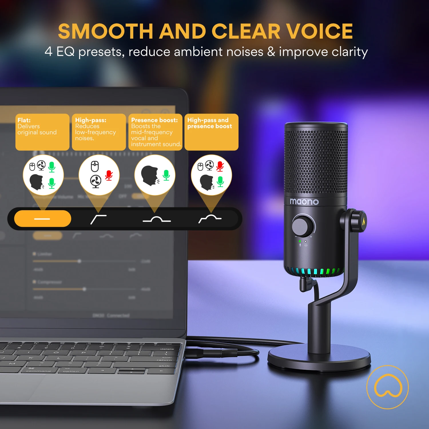 Maono link provides various simple audio settings, sound effects, RGB customization, and advanced audio settings. You can apply settings such as EQ, limiter, and compressor to customize your voice. Download Maono Link for extraordinary gaming and streaming experience.